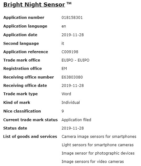 从三星申请的商标名称Bright Night Sensor来看,这应该是一枚主打夜拍的相机传感器,同时三星还有望采用自家的图像传感器组件。同时这项专利是由三星电子于2019年11月28日向欧盟知识产权局(EUIPO)提交的第9类申请,其涵盖了摄像机/摄影设备/智能机/平板电脑的图像或光传感器等产品线。
