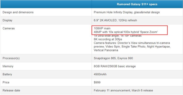 此前有爆料称三星Galaxy S11有望采用1.08亿像素的主摄和五倍光学变焦镜头,以及Space Zoom、Single Take和Video Spin等特色功能。而三星Galaxy S11+将搭载108MP主摄、48MP副摄,外加一颗超广角镜头和一个ToF镜头,支持10倍光学变焦和100倍混合变焦,有高通骁龙865和三星Exynos 990两种处理器版本,内置4900mAh电池,价格999美元。