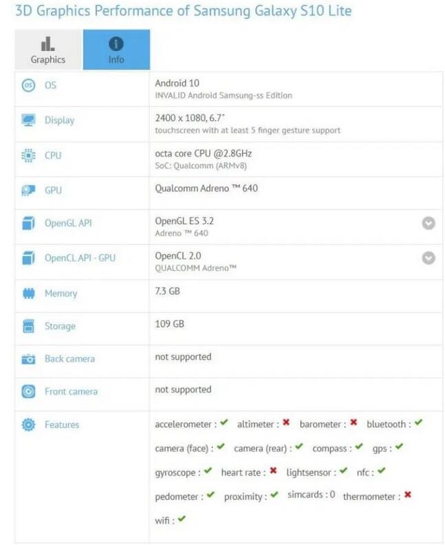 据sumahoinfo报道,在GFXbench上找到了还未发布的三星Galaxy S10 Lite手机的关键配置。