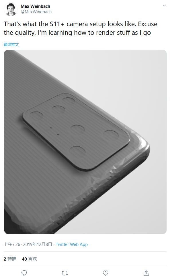 XDA主编Max Weinbach表示,这就是三星Galaxy S11+手机摄像头的样子,很抱歉渲染图质量不高,目前我正在学习如何进行渲染图的制作。